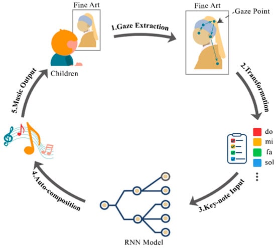 Building upon historical inquiries into color-sound correspondences (e.g., Newton’s mapping of the spectrum to the musical scale) and contemporary understanding of cross-modal integration in cognitive development, this study leverages computational methods to operationalize these principles. The present study translates such historical and theoretical insights into an empirical framework, using AI to dynamically map children’s visual attention (gaze) onto musical parameters, thereby creating a personalized audiovisual experience aimed at enhancing engagement and comprehension in aesthetic education. Specifically, we conduct an in-depth exploration of extracting distinctive artistic elements through systematic analysis of color composition, spatial relationships, and children’s individual eye movement patterns during artwork observation. These carefully extracted visual elements are subsequently transformed into musical notes through a sophisticated mapping algorithm, which are then processed through deep learning architectures to generate rhythmically coherent, emotionally congruent music that maintains semantic correspondence with the observed visual content, as illustrated in Figure 1.