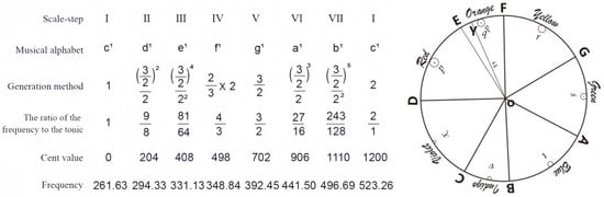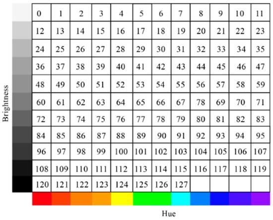The mapping algorithm follows these principles: Musical sequence number 60, representing middle C (C4, or “do” in fixed-do solfège), corresponds to pure red at 100% saturation and brightness. Color transitions in steps of 12 (representing one octave in the chromatic scale) correspond to octave rises or falls in the musical domain, maintaining the mathematical relationship between frequency doubling and octave intervals. To address potential note omissions or ambiguities during image scanning, pure white and pure black were strategically incorporated as replacement notes for undefined color regions, enhancing the robustness and musical coherence of the note–color correspondence system. This systematic approach resulted in a three-dimensional matrix diagram establishing precise, mathematically grounded relationships between visual colors (defined by hue, saturation, and value) and musical elements (pitch, octave, and duration), as illustrated in Figure 3.