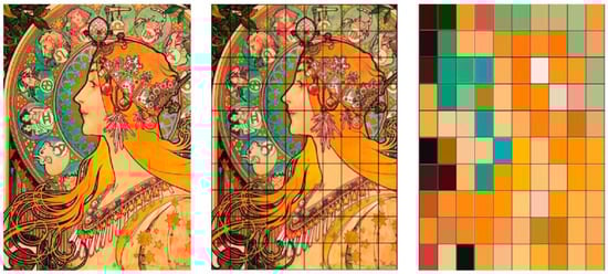 Based on these defined color–note correspondences, complete digital images undergo systematic analysis through a sophisticated scanning algorithm. Images are computationally divided into a 10 × 10 grid (100 cells total), with each cell interpreted sequentially following a left-to-right, top-to-bottom reading pattern that mirrors natural reading behaviors. (The 10 × 10 grid resolution was empirically determined through pilot studies that compared various configurations (e.g., 5 × 5, 10 × 10, 15 × 15). This specific resolution was found to optimally balance the capture of meaningful local color details with the generation of a musically coherent number of notes, avoiding excessive fragmentation from micro-saccades while remaining sensitive enough to reflect the artwork’s compositional structure.) Within each grid cell, advanced color quantization algorithms determine the predominant color based on pixel frequency analysis, with the most frequently occurring color (determined by percentage of pixels within the cell) serving as the primary note assignment for that spatial region. Each processed color block generates a corresponding note value with associated duration proportional to the color’s visual prominence, efficiently establishing spatially aware color–note relationships that preserve both local detail and global structure (Figure 4).