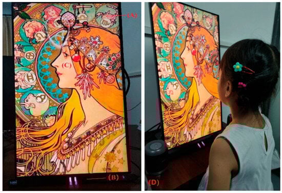 Figure 5. Illustrations of our interface. (A) presents the displayed artwork; (B) presents the Tobbi eye tracker for tracking gaze information; (C) presents the position of the line of sight; and (D) presents a scene of the evaluation experiment.