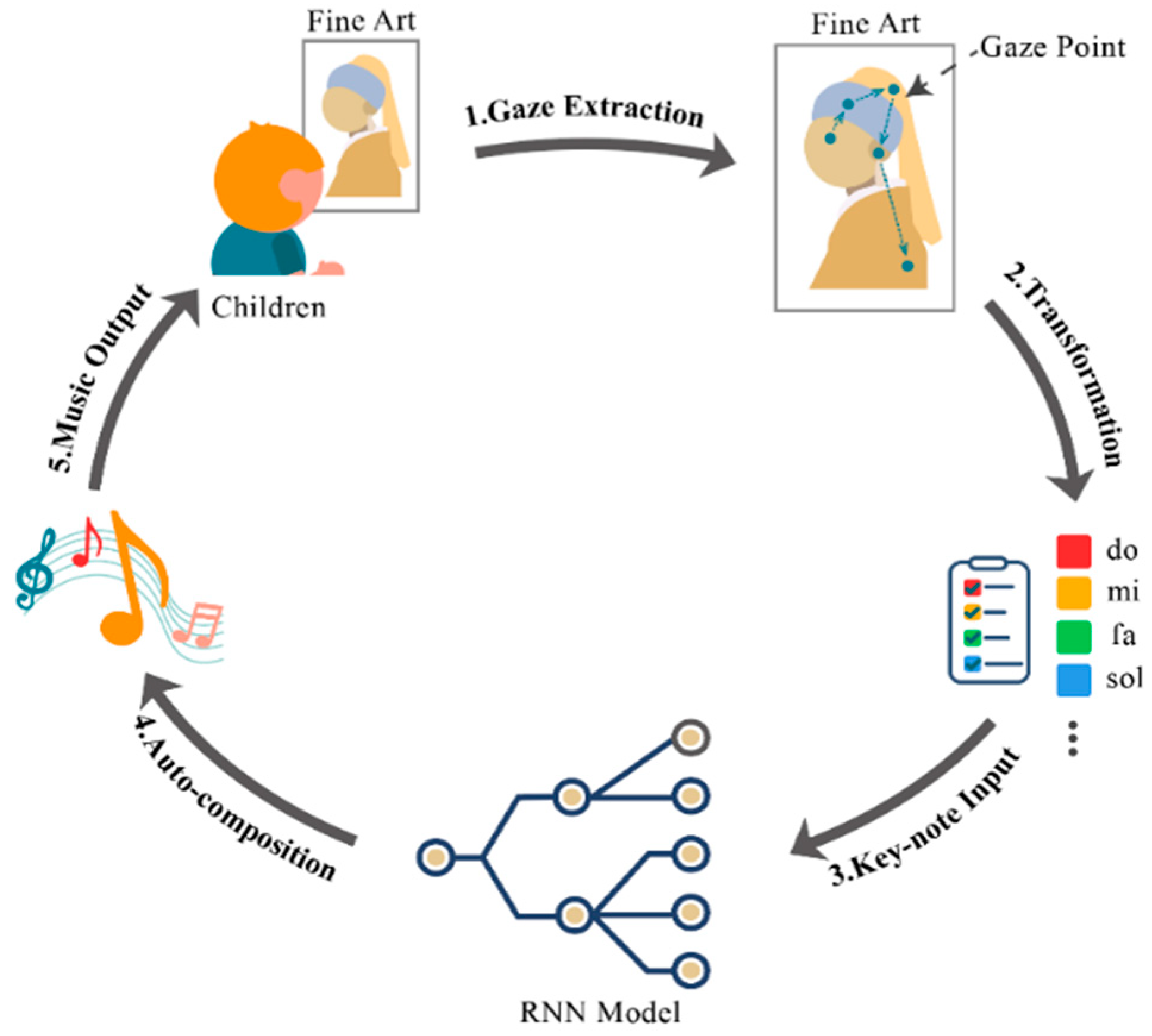 The AI-composed music was generated prior to the main study. The generation workflow involved training our model on gaze data and color mappings from pilot studies. The system was designed to create a musical piece that, based on the pilot data, represented a coherent auditory counterpart to the artwork’s color composition and typical viewing patterns. It first processes children’s eye-tracking data, identifying gaze hotspot regions, dwell times, and scan paths during artwork viewing. Based on 10 × 10 spatial grid division, each gazed region generates corresponding notes according to its dominant color, with gaze duration determining note duration values and scan order establishing temporal note relationships. This mapping process produces an initial note sequence serving as conditional input for the LSTM model, guiding subsequent music generation.