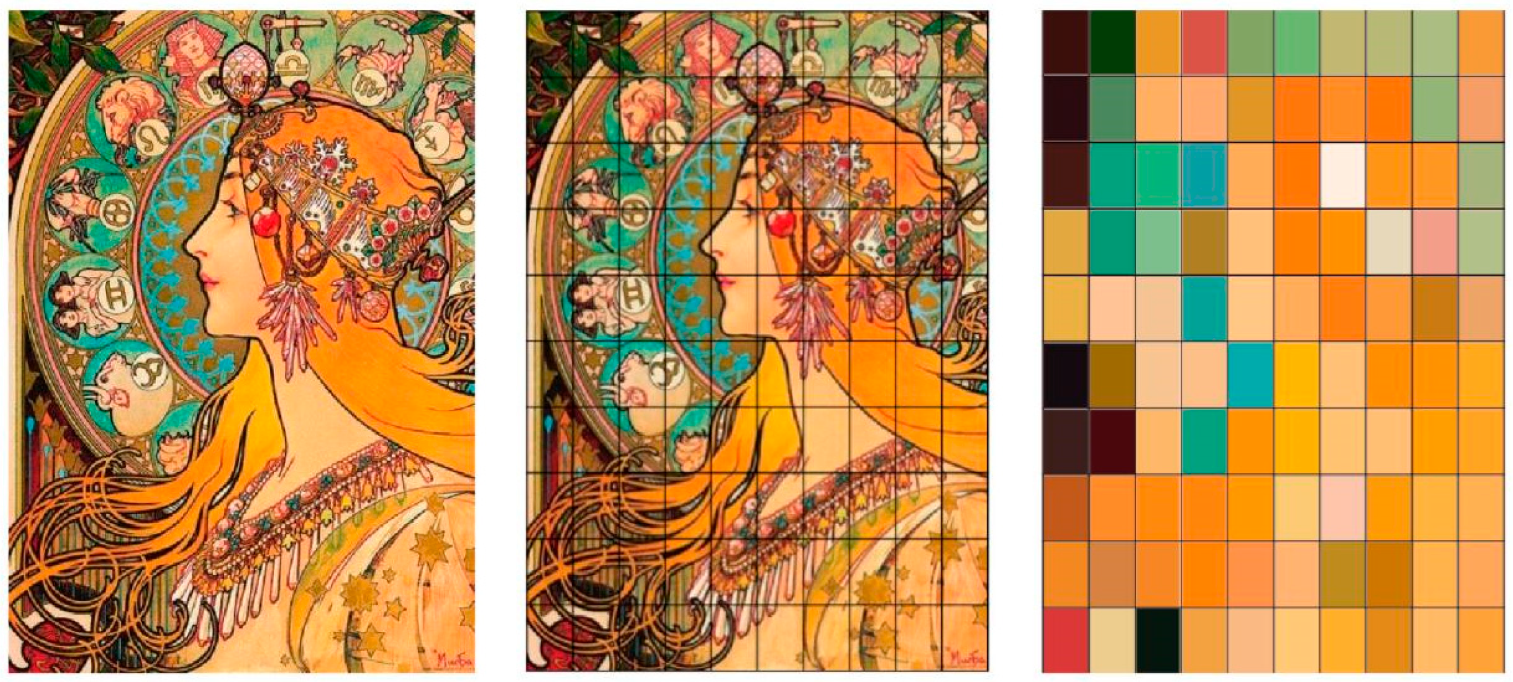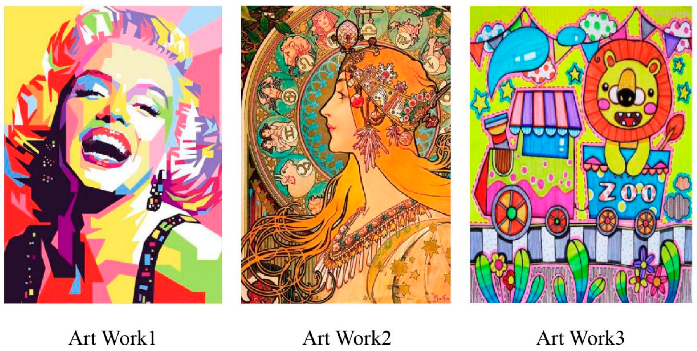 The generation phase employs an autoregressive approach to progressively construct complete melodies. At each time step, the model calculates the probability distribution for the next event through forward propagation based on previously generated event sequences and initial conditions. Each generated event undergoes validity checking to ensure pitch remains within acceptable ranges, duration conforms to basic rhythmic patterns, and velocity changes occur smoothly and naturally. The post-processing stage optimizes and adjusts raw generated sequences. First, rhythmic quantization aligns durations to nearest standard note values (e.g., quarter notes, eighth notes), ensuring rhythmic regularity. Second, pitch range checking prevents extreme pitches outside children’s auditory comfort zones. Finally, structural validation ensures generated melodies maintain overall framework consistency with initial color–note mappings without deviating excessively. The entire generation process typically completes within seconds, achieving real-time transformation from visual input to auditory output, providing children with immediate, personalized audiovisual synesthetic experiences. This study successfully generated personalized musical compositions corresponding to three carefully selected paintings (designated as Art Work 1: “Polychrome Rhythm”—a portrait composition; Art Work 2: “Happy Family”—a portrait composition; Art Work 3: “Jungle Adventure”—an animal scene) through our novel AI composition system based on real-time visual information processing (