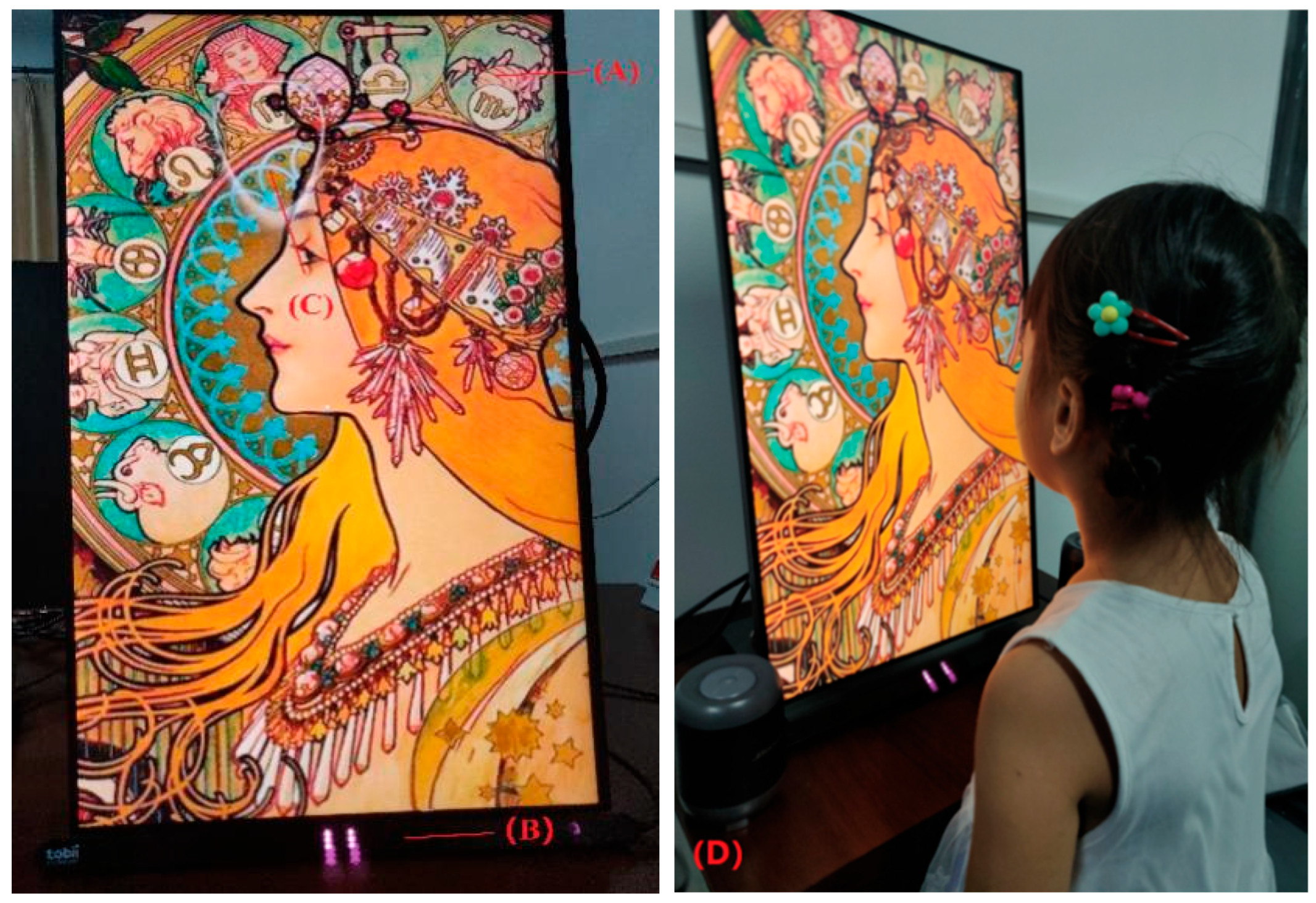 Eye movements were measured binocularly with a Tobii eye tracker 5 which has a gaze accuracy of 0.5°, drift of <0.3°, and acquisition rate of 133 Hz. The three paintings were played on a 15.6-inch monitor, respectively, with a display resolution of 1920 × 1080. Eye movement data acquisition was achieved using the Processing-3.5.4 software. Children sat in a comfortable chair without their head being fixed so that the screen was positioned in primary gaze at a working distance of 60 cm. A 5-point calibration was completed for each child at the beginning of the data collection session.