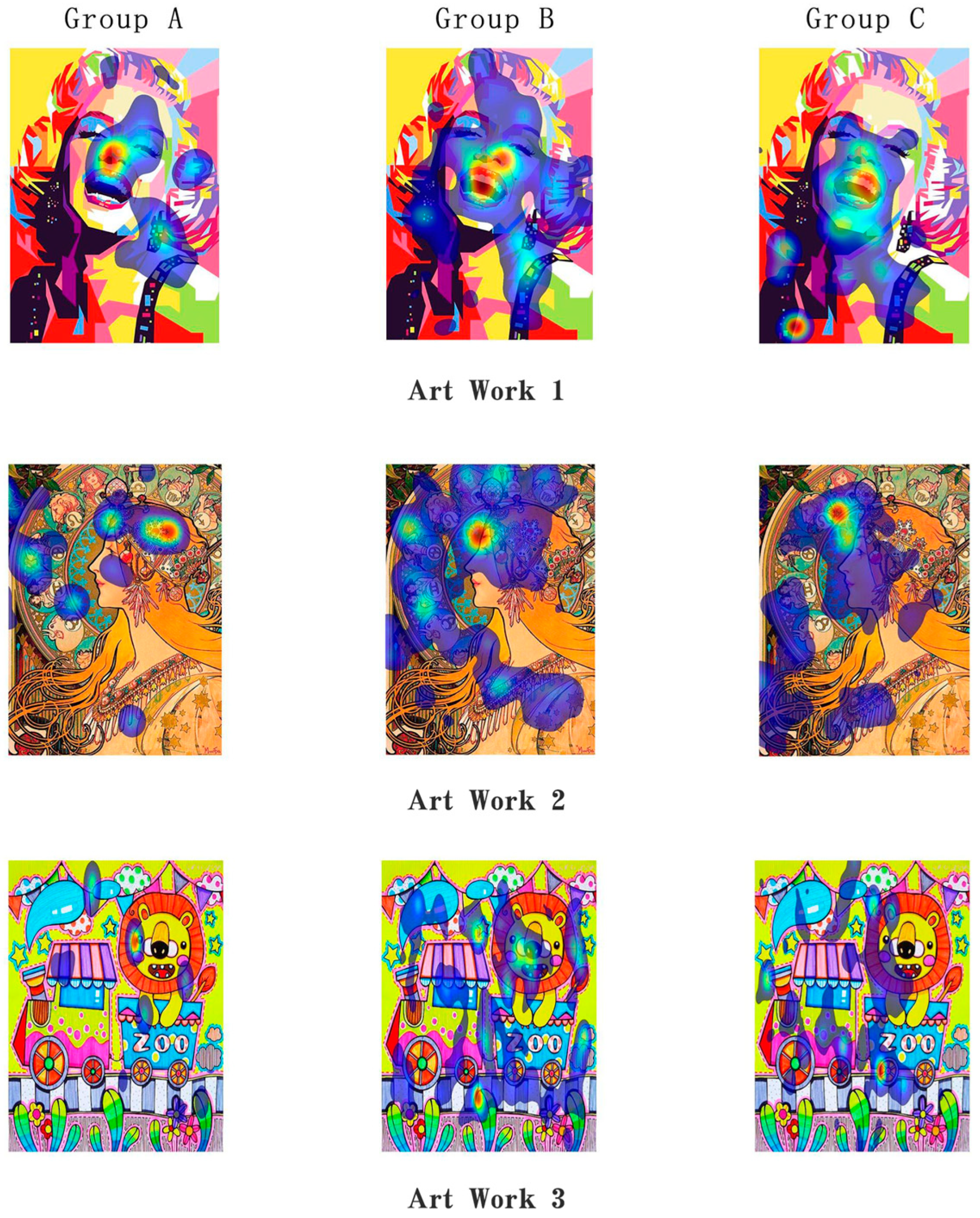 Table 4 for details), Group B exhibited significantly different attention distribution patterns compared with the control group. For the three artworks with