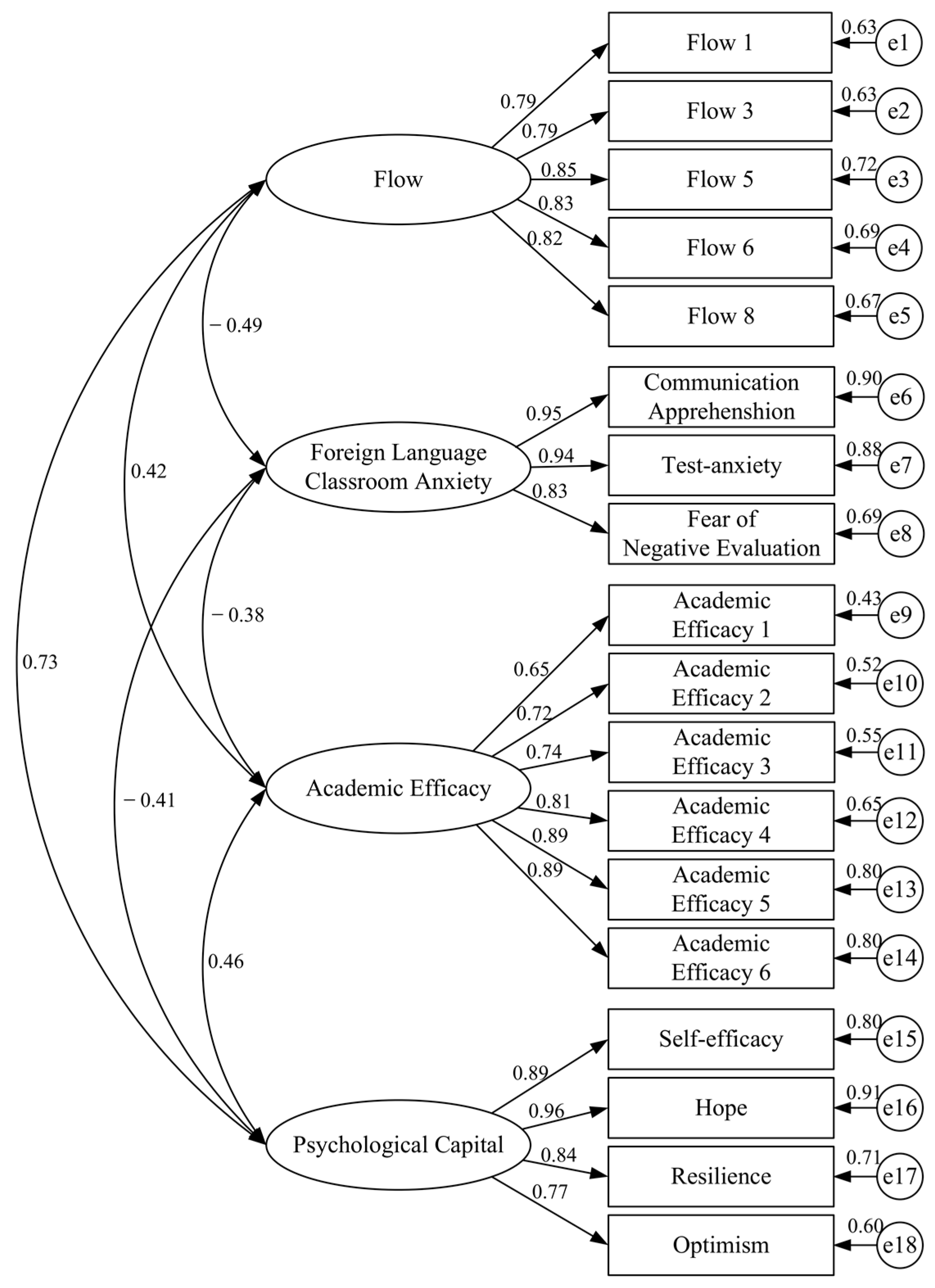 2.5. The Role of FLCA and Academic Efficacy in the Relationship Between Flow and PsyCap