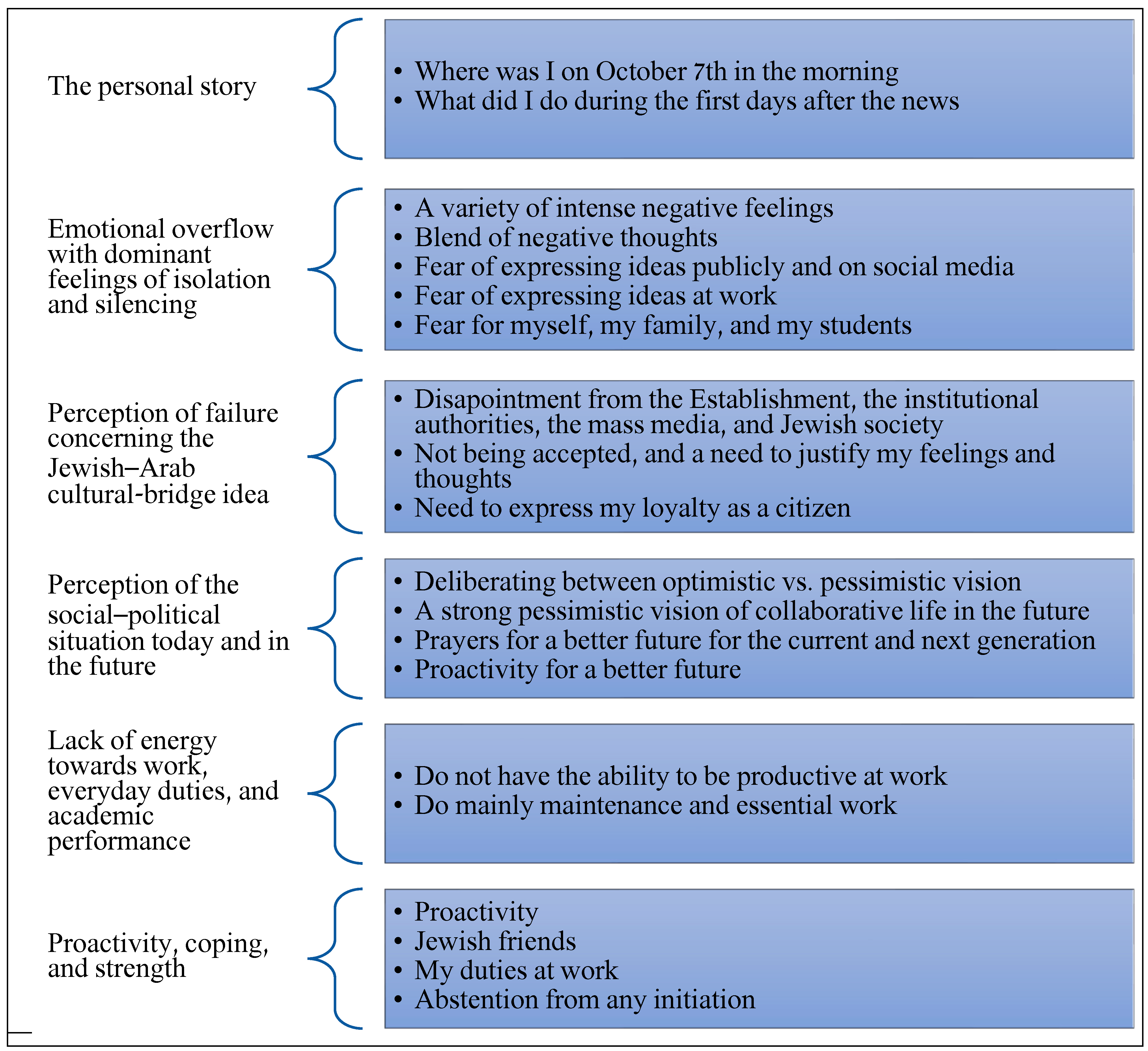 - The personal story—how the events of 7 October affected me personally. There are several natural disasters and manmade incidents or events that everyone who was living on Earth while they occurred will remember for the rest of their lives; specifically, they will remember not only what happened, but also where they were, and what they were doing (such as the President Kennedy assassination, the 9/11 Twin Towers collapse, Prime Minister Yitzchak Rabin’s assassination, the beginning of the 1973 Yom Kippur War in Israel, the UN declaration establishing Israel as a State for the Jewish Nation, etc.) (e.g., Monteil et al., 2020; Russo & Moses, 2013). This was evident in our interviews. All the participants, without exception, at the onset of the interview chose to describe where they were and what they were doing at 06:30 AM. 7 October was several days before the beginning of the new academic year. Hence, many people were still on vacation abroad. Half of the participants were abroad and described in detail what they did from the moment they heard the news to the moment of their return home. Here are several examples:
