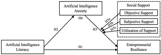 In summary, grounded in COR theory, this study investigates the mechanism through which entrepreneurs’ AI literacy influences entrepreneurial resilience, with a specific focus on the mediating role of AI anxiety. It further explores the role of social support, focusing on its moderating effect on the connection between AI anxiety and entrepreneurial resilience. By systematically elucidating these pathways, this research offers valuable insights to advance theoretical understanding and practical guidance for fostering entrepreneurial resilience in the AI-driven context. The detailed research model is presented in Figure 1.