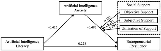 As shown in Table 2, we conducted descriptive statistics and correlation analysis. AI literacy was significantly negatively correlated with AI anxiety (r = −0.402, p < 0.001) and significantly positively correlated with entrepreneurial resilience (r = 0.386, p < 0.001). Additionally, AI anxiety was significantly negatively correlated with entrepreneurial resilience (r = −0.475, p < 0.001) and all three dimensions of social support. The data also showed that objective support, subjective support, and utilization of support all had significant positive correlations with entrepreneurial resilience. The correlations among the main study variables provide preliminary support for the proposed relationships.