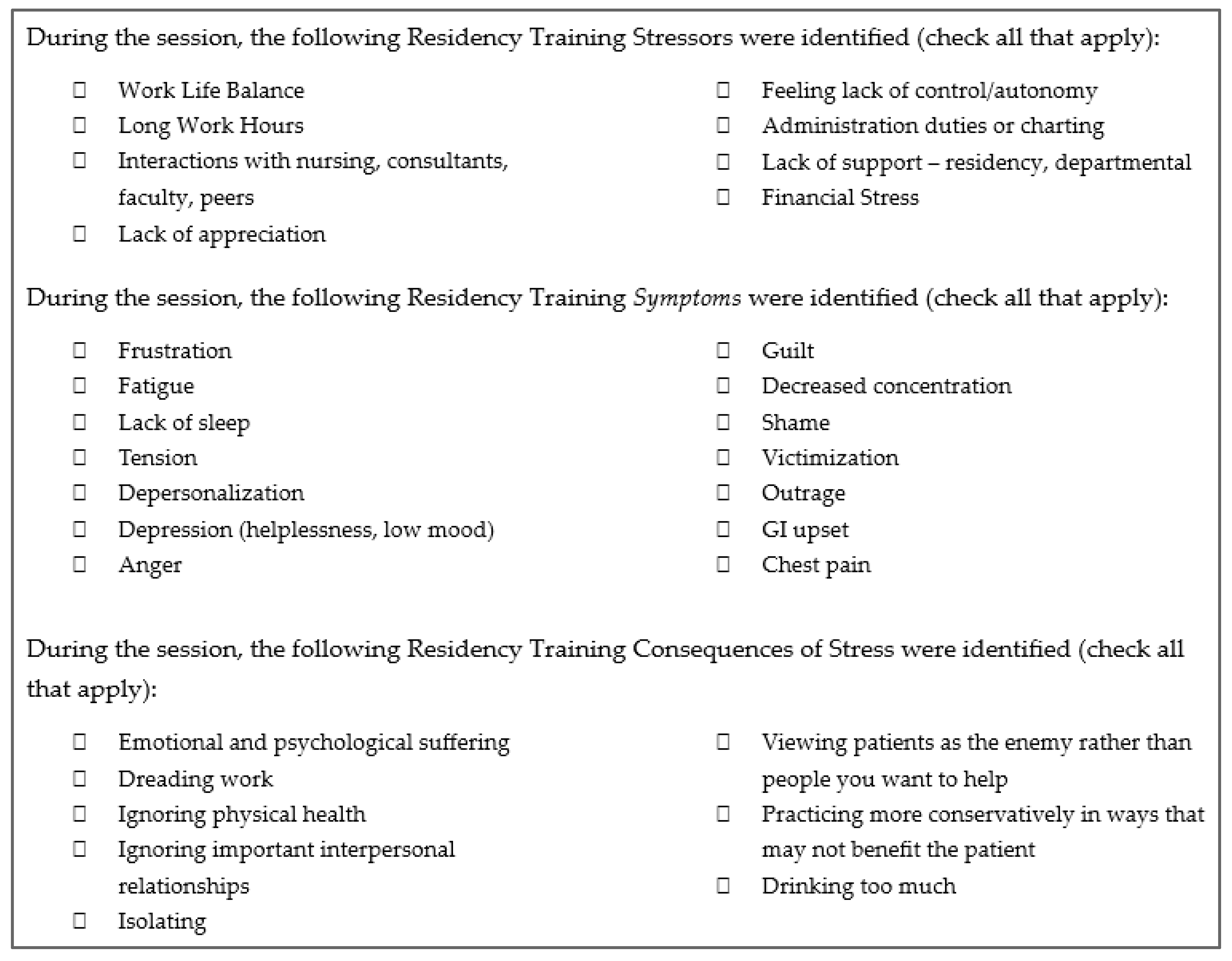 | Residency Symptoms of Stress: “During the session, the following Residency Training Symptoms of Stress were identified (check all that apply):” | |||