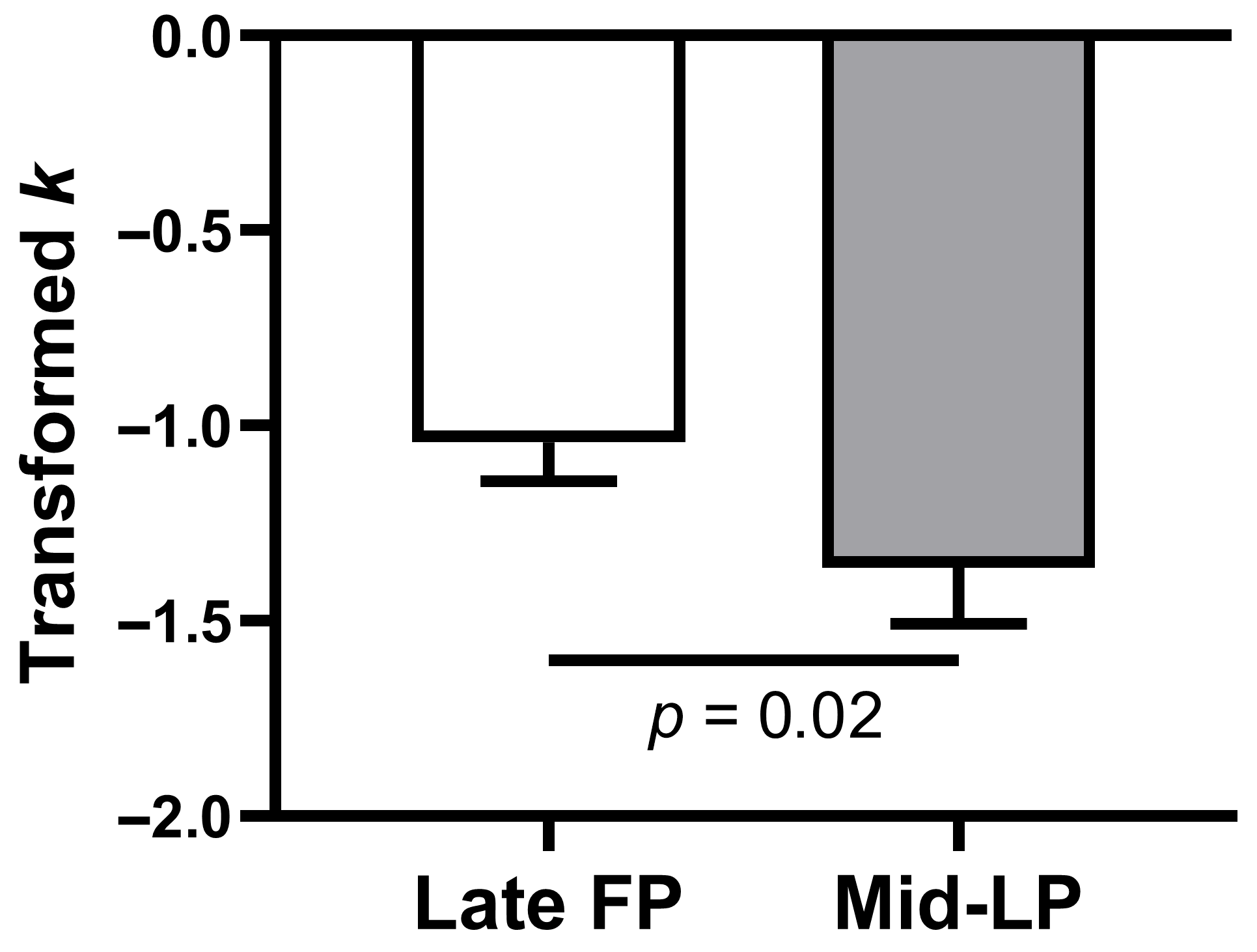 k) was significantly higher in the late FP than in the mid-LP (mean ± SE, −1.04 ± 0.10 vs. −1.36 ± 0.14;