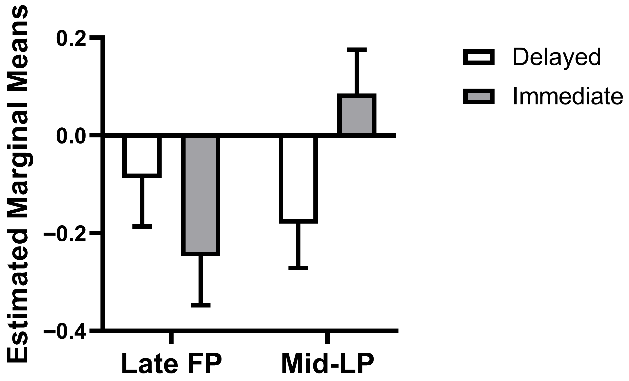 p = 0.008, 95% CI = [−0.57, −0.09], Bonferroni-corrected α = 0.025). In the late FP, however, the pattern was numerically reversed and non-significant (mean difference = 0.09, SE = 0.12,