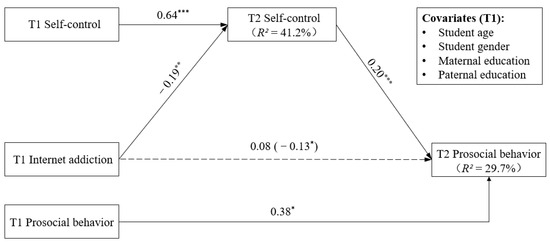 The mediating effect of self-control in the relationship between internet addiction and prosocial behavior. Note: The unstandardized coefficients are reported. * p < 0.05, *** p < 0.001. The dashed line indicates a non-significant coefficient. Same as below.