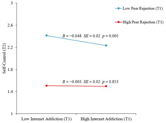 The moderated mediation model fit the data well: χ2 = 28.31, df = 15, p < 0.05; RMSEA = 0.029 (90% CI = [0.011, 0.045]); CFI = 0.985; and SRMR = 0.017. The results are displayed in Table 3 and Figure 3, revealing that T1 peer rejection moderated the relationship between T1 internet addiction and T2 self-control (B = 0.17, SE = 0.79, p = 0.027, β = 0.07). As shown in Figure 4, the decomposition of the interaction using simple slope analyses revealed that, in contrast to individuals with high levels of peer rejection (B = −0.003, SE = 0.02, p = 0.853), for those with low levels of peer rejection, internet addiction more robustly negatively predicted self-control (B = −0.05, SE = 0.02, p = 0.005). It is only in the context of low peer rejection that internet addiction indirectly influences prosocial behavior through its impact on self-control. Importantly, the indirect effect of self-control was also moderated by peer rejection. As shown in Table 4, the results of the bias-corrected bootstrapped estimates indicated that the indirect effect of a low level of T1 internet addiction on T2 prosocial behavior via T2 self-control was significantly greater when T1 peer rejection was lower (B = −0.05, SE = 0.02, 95% CI = [−0.089, −0.020]) than when T1 peer rejection was higher (B = −0.003, SE = 0.02, 95% CI = [−0.036, 0.029]). In conclusion, these results support the idea that internet addiction has a greater negative association with adolescents’ prosocial behaviors via self-control when peer rejection is lower. Thus, Hypotheses 3a and 3b were supported.