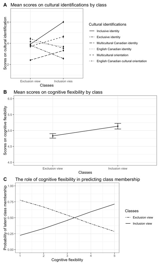 Based on the maximum allocation probability, participants were assigned to classes that comprised 52.13% and 47.87% of the sample. Figure 1A illustrates the patterns of responses in inclusion–exclusion views on cultural identification. The probability to endorse greater scores on multicultural acculturation orientation, multicultural personal identification, and the inclusive view of the Canadian national identity was higher in the first class (mean score difference between classes t(199.54) = 5.44, p < 0.001 for multicultural acculturation orientation; t(198.63) = 7.82, p < 0.001 multicultural personal identification; t(198.56) = 12.88, p < 0.001 for Canadian identity inclusiveness). This class was labeled as inclusion view. In turn, the second class had the highest probabilities of scoring high on English Canadian acculturation orientation, English Canadian personal identification, and Canadian identity exclusivity (mean score difference between classes t(188.9) = 2.93, p = 0.004 for English Canadian acculturation orientation; t(194.66) = 3.58, p < 0.001 for English Canadian personal identification; t(199.14) = 7.46, p < 0.001 for Canadian identity exclusivity), and was labeled exclusion view. Interestingly, as Figure 1A demonstrates, English Canadian personal identification was higher than multicultural personal identification in both inclusion view (t(106) = −3.66, p < 0.001) and exclusion view (t(94) = 14.79, p < 0.001) classes. However, it was significantly lower in the inclusion view class than in the exclusion view class (t(194.66) = −3.58, p < 0.001), suggesting a decreasing tendency in the strength of personal identification with the English Canadian group in the presence of increasing strength of identification with the multicultural group. As expected, mean score on cognitive flexibility was higher in the inclusion view class (t(182.5) = 2.72, p = 0.007, see Figure 1B).