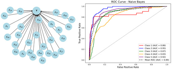 where represents the target variable, namely, the predicted outcome of satisfaction; denotes a feature, with each variable having possible states (corresponding to the Likert scale, ); refers to the prior probability of the target variable; and is the posterior probability given .