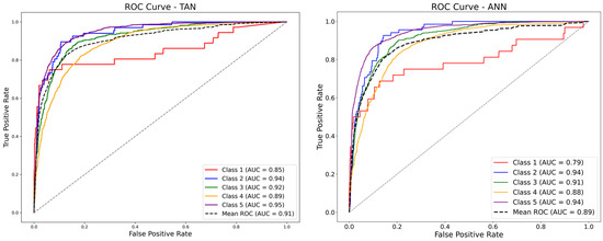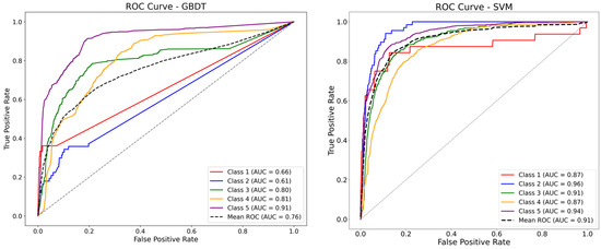 The ROC curve plots True Positive Rate (TPR) against False Positive Rate (FPR) to evaluate model performance across different classification thresholds, with the Area Under the Curve () serving as a key performance indicator. In multi-class tasks, the “one vs. all” approach is used, and in this study, five ROC curves were calculated to assess the model’s ability to distinguish between categories.
