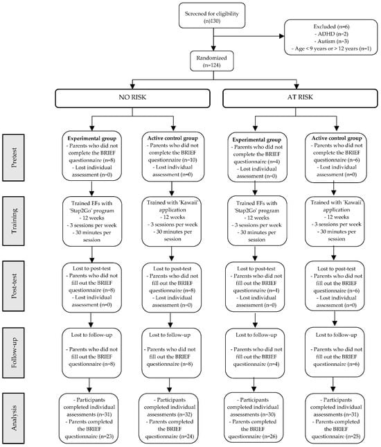 One hundred and twenty-four children aged 9–12 years old participated in this study (M = 11.1, SD = 0.82), with 50.8% being boys and 49.2% girls. The experimenter contacted various schools of Canarias Island (Spain), and ultimately, one of them consented to participate in the study. Children were enrolled in a regular school. Initially, participants were divided into two main groups based on their condition: children at psychosocial risk (at-risk) or children without psychosocial risk (no-risk). Secondly, participants in each condition were randomly allocated to two training groups: the experimental group (STap2Go training) or the active control group. All study participants were informed of the purpose of their participation, and parental consent was obtained from all participants. Parents and teachers were blinded to the children’s group assignments. Table 1 shows participants sociodemographic characteristics.