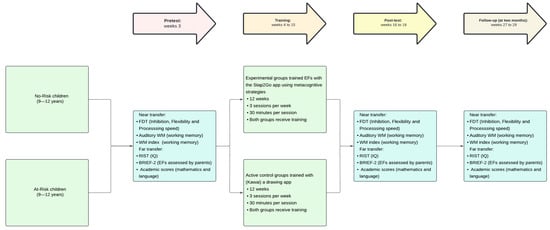 This study primarily aims to assess the effects of a digital strategy-based method for the training of EFs, “STap2Go”, in children without psychosocial risk (no-risk) and children at psychosocial risk (at-risk) (O1). Specifically, we evaluated Stap2Go’s impact on their EFs, intelligence, processing speed, academic performance, and emotional regulation. We expect that STap2Go will produce near transfer (EFs, processing speed) and far transfer (academic scores, IQ, and emotional regulation) after training for children with and without psychosocial risk. Secondly, we aim to evaluate whether the training impact differs between children without psychosocial risk and those at psychosocial risk (O2). We also anticipate greater training gains for children at psychosocial risk.