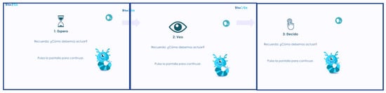 Example of Stap2Go strategy applied by avatar. Figure 5 legend: Self-control strategy in Stap2Go exercise applied when user taps impulsively: 1—“Wait” “Do you remember how we should act? 2—“See” “Do you remember how we should act? 3—“Decide” “Do you remember how we should act? (). Reproduced with permission.