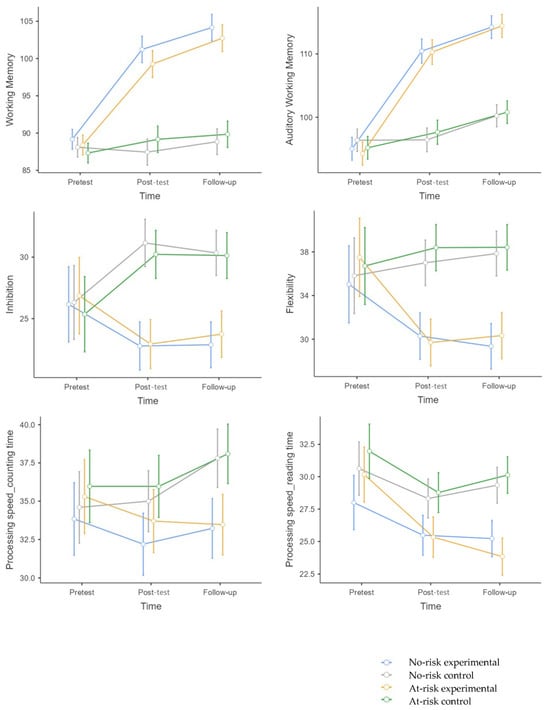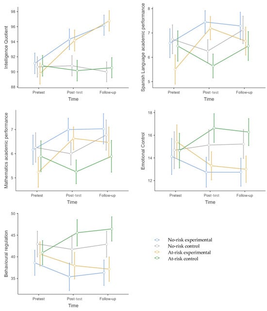 The main effect of the time*group*risk condition was marginally significant (F (1,122) = 2.80, p = 0.06, η2p = 0.02). Children without psychosocial risk (no-risk): compared to the control group (no-risk), significant differences were found at post-test (p < 0.001, g = 2.3) and follow-up (p < 0.001, g = 2.7) in favor of the experimental group. Children at psychosocial risk (at-risk): compared to the control group (at-risk), significant differences were found at post-test (p < 0.001, g = 2.63) and follow-up (p < 0.001, g = 3.0) in favor of the experimental group. The experimental group (at-risk) significantly improved at follow-up compared to pretest (p = 0.02, g = 0.31). No significant differences were found between the experimental groups (no-risk vs. at-risk) at post-test (p = 1.00) or follow-up (p = 1.00).