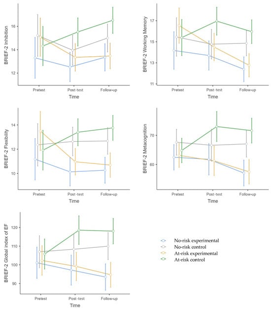 The inclusion criteria for the children without psychosocial risk (no-risk) were as follows: (1) aged 9–12 years old, (2) no psychological or psychiatric diagnosis, (3) no special educational needs, (4) no course repetition, (5) an intelligence quotient (IQ) between 85 and 115, (6) and no clinical scores on the Behavioral Assessment of Executive Function (BRIEF-2) behavioral and emotional regulation indices at T1 (). The exclusion criteria for the no-risk group were as follows: (1) minors younger than 9 years old or older than 12 years old, (2) psychological or psychiatric diagnosis, (3) special educational needs, (4) course repetition, (5) IQ < 80 or >115, and (6) clinical scores on BRIEF-2 Behavioral and Emotional Regulation Indexes at T1.