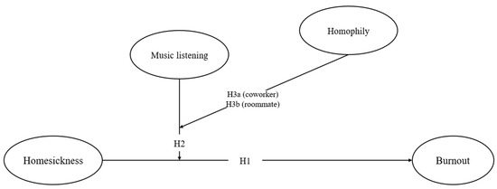 Roommate homophily strengthens the moderating effect of non-working-time music listening on the homesickness–burnout relationship, such that the positive relationship between homesickness and burnout becomes stronger when listening to music with roommates with whom one shares high homophily.