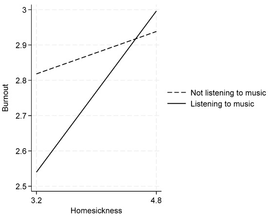 The analysis of music listening during off-work time revealed two key findings. First, Column 2 shows that off-work music listening has a direct negative association with burnout (β = −0.107, p < 0.05). More importantly, Column 3 reveals a significant positive interaction between homesickness and off-work music listening (β = 0.210, p < 0.01), indicating that music listening strengthens the positive relationship between homesickness and burnout, as depicted in Figure 2. These findings support Hypothesis 2.