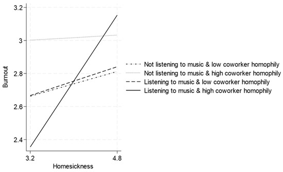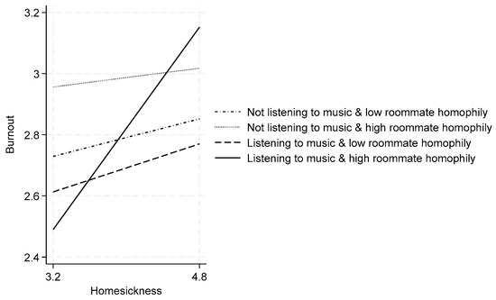The most complex relationships emerge in the roommate-homophily analysis. Column 4 shows that roommate homophily is positively associated with burnout (β = 0.102, p < 0.01). More importantly, Column 5 reveals a significant three-way interaction between homesickness, off-work music listening, and roommate homophily (β = 0.197, p < 0.05). As illustrated in Figure 3, the moderating effect of music listening is particularly pronounced when roommate homophily is high. Specifically, the difference in the homesickness–burnout relationship between those who listen to music and those who do not is substantially larger under conditions of high roommate homophily compared to conditions of low roommate homophily. These findings provide strong support for Hypothesis 3a.
