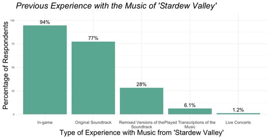 Overall, most respondents indicated high levels of familiarity with the music of Stardew Valley prior to attending Festival of Seasons concerts, with 94% of participants indicating that they had been at least somewhat familiar with the music before attending. To better assess how listeners developed this high level of familiarity with the music, we asked respondents to select all the different ways they engaged with the music prior to the concert. Figure 1 summarizes the distributions of these engagements.