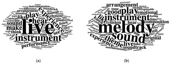(a) Word cloud for descriptions of musical differences across in-game and concert experience. (b) Word cloud for descriptions of musical similarities between the contexts. In both word clouds, all words were lemmatized, stop words were removed, and only words with more than one occurrence are visualized.