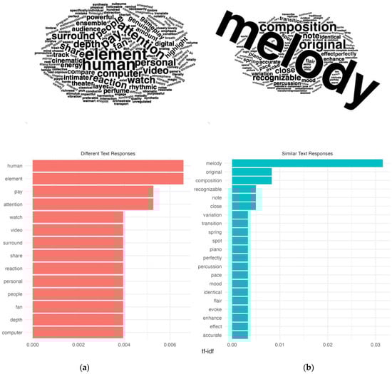 After this visual inspection of word clouds, we used the tidytext package in R (Silge & Robinson, 2016) to calculate term frequency–inverse document frequency (TF-IDF) values for each word in the corpus of responses. Adding nuance to the frequency counts used to create Figure 2 (the above word clouds), this technique identifies the most prominent terms used for both groups of responses, allowing us to assess which musical features listeners prioritized when making their comparisons. We treated each group (different and similar) as entire documents when generating the TF-IDF values for each lemmatized word. Rather than focusing on individual responses, we focused on the group level to uncover broader patterns in word usage across these two groups.