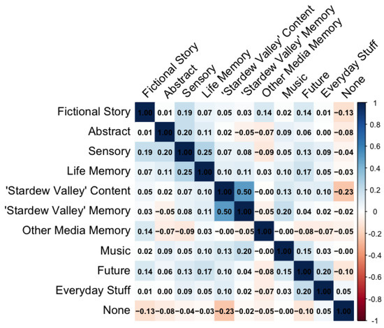 Figure 6 summarizes the degree to which individual thought types co-occurred for concertgoers, calculated by performing Pearson’s correlations on pairs of binary variables. All significant correlations are summarized in Table 5. The strongest correlation (φ = 0.5, p < 0.001) occurred between life memories associated with Stardew Valley and specific thoughts about content from the game, indicating that participants who experienced one of these thought types also often experienced the other. Recalling life memories was correlated with future thoughts (φ = 0.17, p = 0.03), potentially suggesting a clustering of autobiographical thoughts cued by the game’s music. The positive correlation between thoughts about the music and Stardew Valley memories (φ = 0.2, p = 0.01) supports this interpretation.