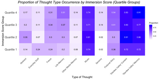 Proportion of thought type occurrence across immersion quartile groups.