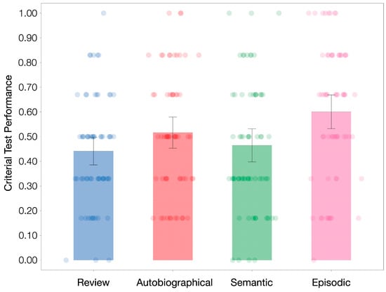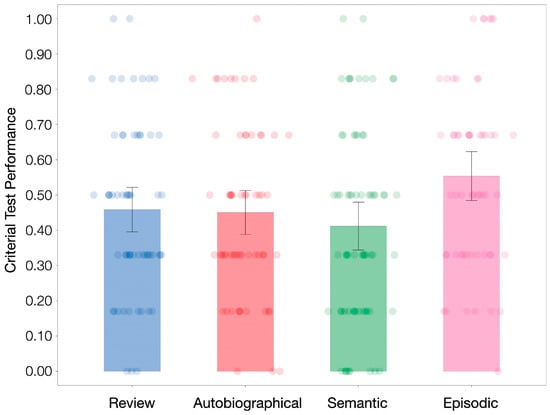 Criterial test performance across conditions of Experiment 2. Error bars denote 95% descriptive confidence interval. Direct comparisons reveal that episodic retrieval, but not semantic or autobiographical retrieval, significantly enhances new learning when compared to review.