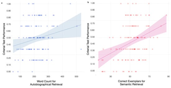 Relationship between engagement in content-irrelevant retrieval conditions and criterial test performance. Horizontal jitter is introduced to improve data visibility. We scale the amount of jitter to the content-irrelevant retrieval variable. The scatterplot in Panel (a) shows autobiographical retrieval engagement and criterial test performance. Engagement was measured by word count (horizontal jitter ±5). The scatterplot in Panel (b) shows semantic retrieval engagement and criterial test performance. Engagement is measured by the number of correct exemplars generated (horizontal jitter ±1).