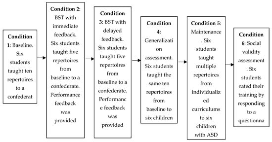 In this study, six participants were allocated into two triads. Within each triad, the baseline condition was established first. Across sessions, each participant conducted sequences of ten trials to teach skills to a confederate. An experimenter collected data on the correct and incorrect implementation of DTT components. After a low and stable performance was demonstrated, an intervention started for one participant, and the others remained in the baseline condition. The intervention involved the four components of BST in the following order: didactic instructions about the skills to be taught, modeling (the experimenter rehearsed the correct implementation of trials with the confederate), role-play (each university student conducted trials with the confederate), and performance feedback provided by the experimenter per teaching trial across the sessions (immediate feedback).