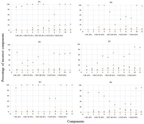 Percentage of implementation errors of DTT components by each participant. Note: Each DTT component (from C1 to C11) was described in the method section on data collection instruments. Each dispersion graph shows the data from one of the six university participants (P1–P6). The data from the graphs refer to each of the research conditions, that is, baseline (BL), BST with immediate feedback (BST IF), BST with delayed feedback (BST DF), generalization assessment (GEN), and maintenance assessment (MAN).
