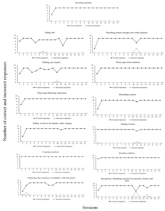 As may be seen in Figure 5, CD1 accumulated 2047 correct responses and only 27 incorrect responses. Thirteen skills were taught during the MAN condition (from session three to session seventeen): 1—sitting still; 2—making eye contact; 3—answering questions; 4—describing non-verbal stimuli (pictures) through vocal verbal sentences; 5—retelling of stories; 6—three-step motor imitation; 7—three-step following instructions; 8—describing actions; 9—reading syllables; 10—copying numbers; 11—following the contours of syllables with the pencil; 12—receptively identifying pictures by function, feature, and class; 13—filling words in the blanks while singing.