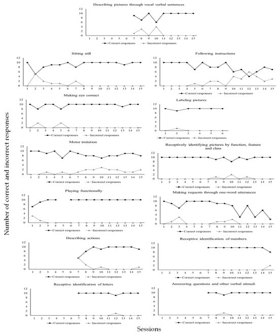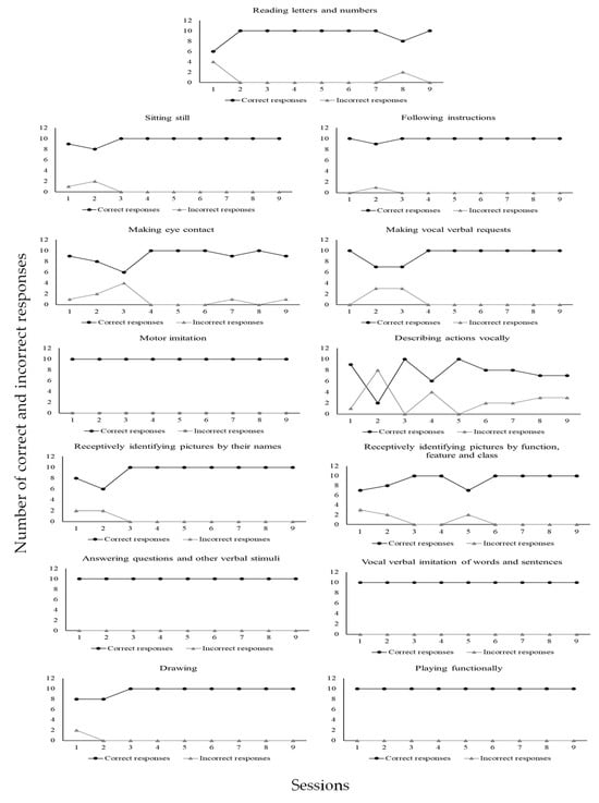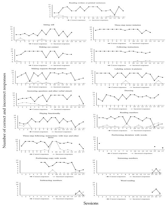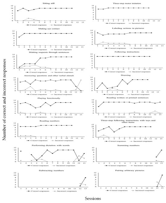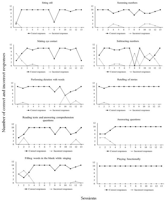 CD2, in turn, accumulated 1145 correct responses and solely 97 incorrect responses. Ten skills were taught during MAN (from session three to session thirteen): 1—sitting still; 2—making eye contact; 3—performing dictation with words; 4—summing numbers; 5—subtracting numbers; 6—retelling of stories; 7—answering questions; 8—reading texts and answering comprehension questions; 9—filling words in the blanks while singing; 10—playing functionally.