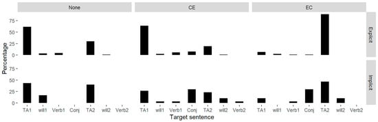 The bar chart in Figure 1 shows the probabilities of different characteristics carrying the primary stress under the three conditions. In the explicit reading, it was shown that most of the primary stresses were on the subjects of the two minor clauses, “TA1/TA2”, which was also the contrastive focus in the complex sentence. Unlike the patterns in explicit reading, the focus assignment showed a varied distribution in the implicit reading. In the CE and EC conditions, the conjunctions suoyi (so) and yinwei (because) showed a much higher percentage of prominent stress in the silent reading than in the actual prosodic realization.