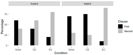 In the CE condition, there was a noticeable difference in the stress patterns between implicit and explicit prosody (χ2 (1) = 20.889, p < 0.001), with more participants in the questionnaire considering the second clause to be more emphasized (but not statistically significant). In contrast, the actual acoustic production stress distribution pattern was reversed, with the first clause having a significantly higher probability of receiving the primary stress than the second.