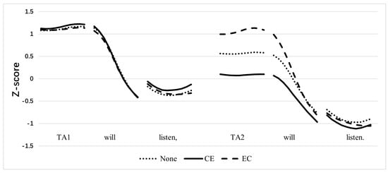 We first examined the pitch contour with a verb in tone 1 under different conditions, as shown in Figure 3. The pitch contours of the suoyi and yinwei conjunctions in CE and EC were removed. The vertical axis represents the average Z-score-normalized pitch of each speaker.