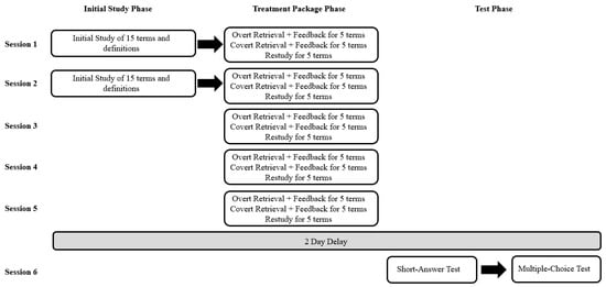 Overview of all experimental sessions. The procedure for session 2 was identical to that of session 1. The initial study phase refers to the first time terms and definitions were studied in that session, which was eliminated after session 2. The treatment package phase was maintained for sessions 3–5, and the procedure for sessions 3–5 was identical. Following a 2-day delay, during session 6, all students completed the final tests and demographic form.