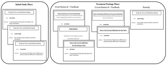 We collaborated with the teacher to create all experimental materials. We targeted concepts that students needed to master for their science class and for their state exams. We selected 15 earth science terms (e.g., jet stream) and definitions (a narrow band of strong, fast winds high in the upper troposphere) from the students’ middle school science textbook that were important for understanding the functioning of Earth’s oceans and atmospheres, as well as for illustrating the principles of energy and matter and of cause-and-effect (e.g., meteorology, convection; all materials provided in the online supplement). The research team drafted a definition of each concept, and the teacher evaluated them for correctness, meeting the goals of course, and test relevancy. As well, the teacher verified that the information had not yet been taught and was presented using language that was suitable for the students’ comprehension capabilities. All materials are available in the online supplement (https://osf.io/p4cq8, accessed on 16 June 2025).