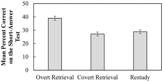 The outcomes of primary interest were students’ performance on the final short-answer and multiple-choice tests, so they are presented first. Next, we present students’ performance for overt retrieval during practice sessions. Because class sample sizes were low (i.e., n = 12 to n = 20), our goal was not to evaluate between-classroom effects, and the power analysis was conducted for the within-participant manipulation rather than the between-participant class variable, we focused analyses on the within-participant manipulation of primary interest. Raw data and analyses by class can be found in the online supplement (https://osf.io/p4cq8, accessed on 16 June 2025).