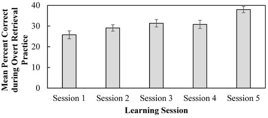 Mean percent correct during overt retrieval across learning sessions. Error bars reflect within-participant standard error of the mean ().