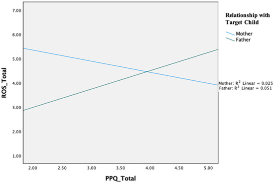 To understand the differences between mothers and fathers in the context of playfulness, we conducted a regression analysis to discover moderation effects. First, we explored whether there was a difference between mother and father playfulness independently, before examining the differences in playfulness within other parenting areas. We conducted t-test analyses to compare the two groups, and we found the following significant differences between mothers’ and fathers’ mean scores: coparenting undermining (Mmom = 2.56, SDmom = 1.65; Mdad = 3.63, SDdad = 1.92; t = −3.56, p < 0.001), child’s behavior inventory (Mmom = 4.07, SDmom = 0.52; Mdad = 3.85, SDdad = 0.48; t = 2.85, p = 0.005), child’s manifestation of joy (Mmom = 4.48, SDmom = 0.48; Mdad = 4.21, SDdad = 0.62; t = 2.93, p = 0.005), child’s sense of humor (Mmom = 3.84, SDmom = 0.75; Mdad = 3.48, SDdad = 0.70; t = 3.16, p = 0.002), child’s cognitive spontaneity (Mmom = 4.03, SDmom = 0.83; Mdad = 3.57, SDdad = 0.84; t = 3.67, p < 0.001), and challenging parenting behaviors (Mmom = 3.35, SDmom = 0.59; Mdad = 3.66, SDdad = 0.74; t = −2.93, p = 0.005).