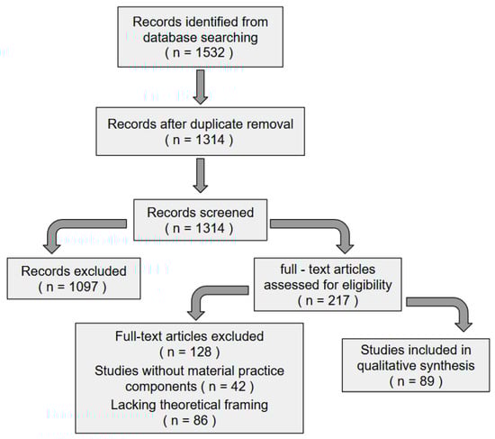 Peer-reviewed literature from 2010 to 2023 was thoroughly reviewed using Web of Science, Scopus, and specialized design education journals. Three conceptual clusters were combined in the search strategy: pedagogy (“art education” OR “design pedagogy” OR “materiality”), technology (“immersive virtual reality” OR “IVR” OR “haptics”), and embodiment (“embodied cognition” OR “sensorimotor learning”). After thorough screening of 1532 initial records, 89 studies fulfilled the inclusion criteria addressing RQ1’s emphasis on the manifestation of embodied principles in IVR pedagogy. The systematic review process followed the PRISMA guidelines as illustrated in Figure 1.