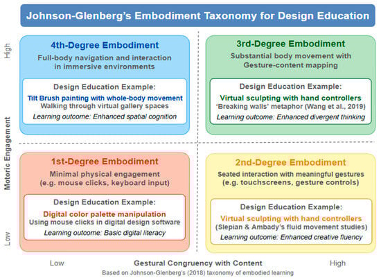 Johnson-Glenberg’s embodiment taxonomy with design education examples. The diagram illustrates the four degrees of embodiment from Johnson-Glenberg’s taxonomy with corresponding design education examples and learning outcomes (Wang et al., 2019; Johnson-Glenberg, 2018).