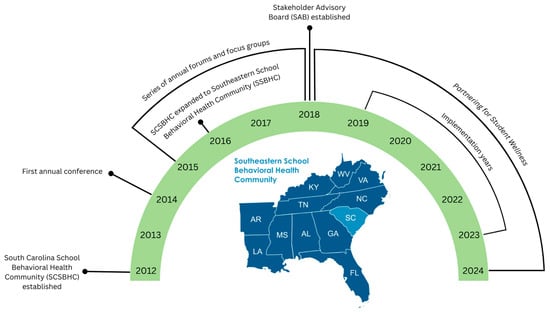 Following the 2015 conference, SCSBHC leaders received the PCORI Engagement Award to advance SBH across the southeast region. This began with separate focus groups involving researchers, community partners, and behavioral healthcare recipients across South Carolina, focusing on the five core themes reviewed in the above section (see ). In addition, PCORI leaders and community partners from the Engagement Award recommended the expansion of the SCSBHC to become the Southeastern School Behavioral Health Community (SSBHC). To this day, the SSBHC connects leaders, practitioners, youth, and families across education, mental health, and other youth-serving systems throughout the southeastern region of the U.S. through a website (see www.schoolbehavioralhealth.org), a large and growing listserv, and an annual SBH conference (drawing over 1000 interdisciplinary participants in recent years). The geography of the SSBHC and a timeline of key events are depicted in Figure 1.